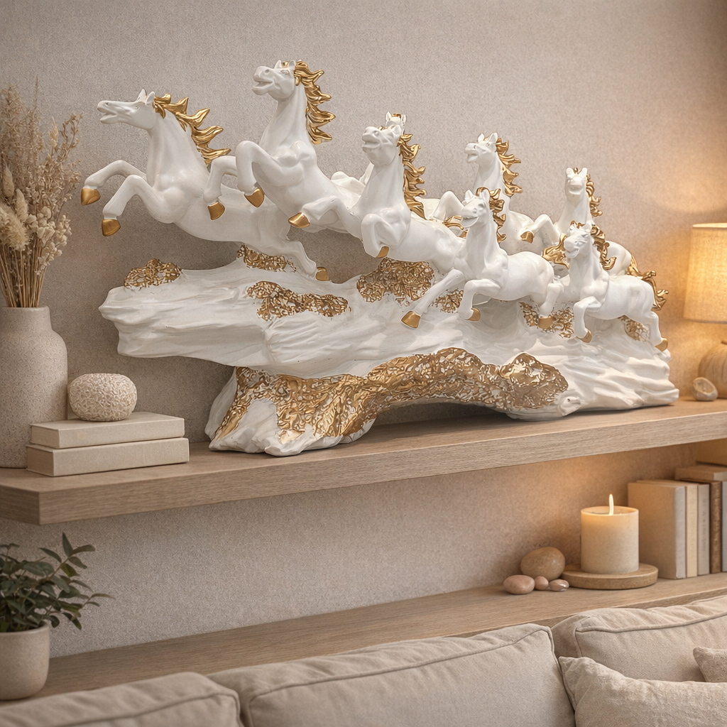 8 Running Horses Statue for Home Décor: Exquisitely crafted resin sculpture featuring seven galloping white horses on a golden wave base, symbolizing success, power, speed, and prosperity according to Vastu and Feng Shui.